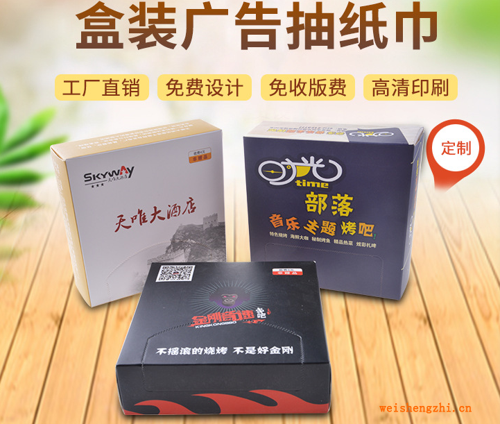 抽纸已成为一种新的广告形式,成为广大商户的喜爱!更适合餐饮业、娱乐业、保险业、汽车业、酒水业等多种行业的赠品及促销品,它包装精美,用途广泛,所以在车内、办公桌上、家居卧室、酒店客房等随处可见。纸抽还可以有利于提升企业品牌形象,方便客户记住企业电话,从而提高企业营业额。